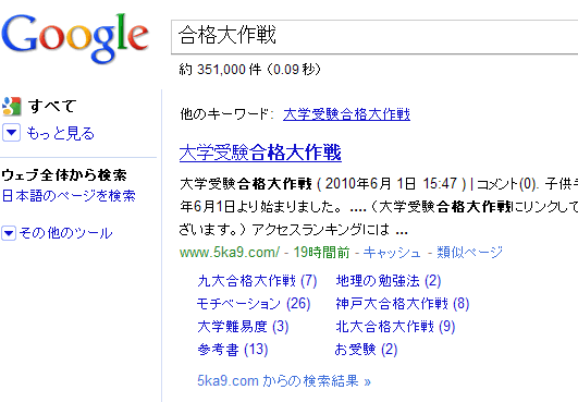 googleで『大学受験合格大作戦』と検索したところ、TOPページ以外のカテゴリーも多数表示されることがわかりました。