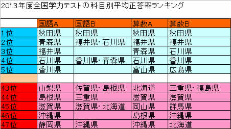 2013年(平成25年全国学力テストの科目別平均正答率ランキング)