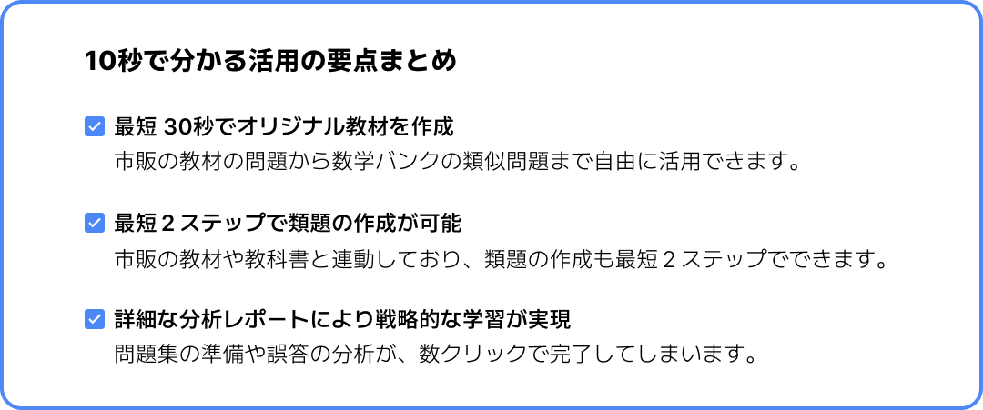 その過程で、生徒一人一人にあわせた苦手分野の克服を図ろうとして、何時間もかけてオリジナル教材や復習テストを作成した、という経験がある方も少なくないのではないでしょうか? そうした試みは素晴らしいことですが、一方で、個々人に対応した教材を作成しようとすると、授業準備に過剰に時間がかかってしまい、先生方に過度の負担がかかってしまいます。
