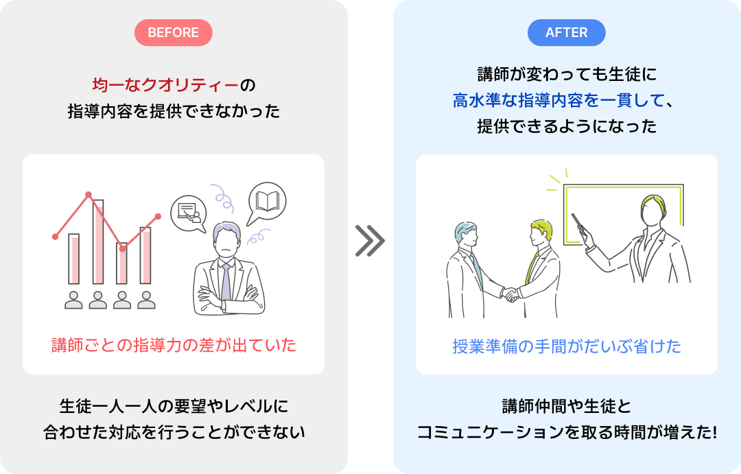数学バンクを導入する前に抱いていた課題は何でしたか?生徒指導の面では、なかなか均一なクオリティの指導内容を提供できないことが課題でした。個別指導の授業では、一律に決められた指導内容を生徒に提供するのではなく、生徒一人一人の要望やレベルに合わせた対応を行うことが一般的です。しかし、そうした個々人にあわせた対応を行うと、どうしても講師ごとの指導力の差が出やすくなってしまいます。