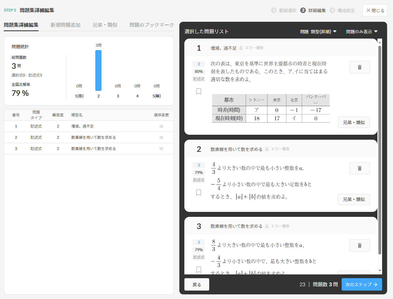 従来は時間がかかっていた問題集の準備や誤答の分析が、数クリックで完了してしまいます。また、数学バンクは、ICT教材には珍しく市販の教材や教科書と連動しており、様々な教材を用いて指導を行っている先生方にお使いいただけます。生徒の復習のために類題を用意しようとするも、時間がかかってしまう……という苦い経験ともおさらば。そうした類題の作成も、最短2ステップで完了してしまいます。