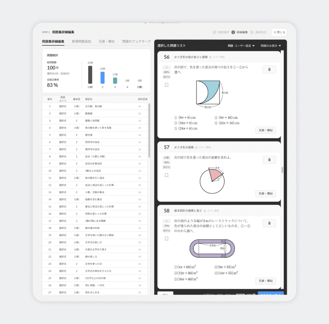 学習塾では、生徒の学習成果を向上させるためにも、生徒の学習状況を可視化するためにも、ICT教材の導入が効果的です。その中でも、数学バンクは自由に問題数や難易度を設定して、柔軟に問題集を作成可能です。細かく単元や問題タイプを指定した上で難易度も調整できるので、「積分の計算がどうしても苦手」「応用問題で実践力を鍛えたい」などといった生徒の幅広いニーズに事細かな対応ができます。