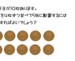 クイズ 数学pickup算数クイズ 【頭の体操】10円玉が10枚あります。これを4枚ずつ並べて5列に配置するにはどうすればよいでしょう? 算数の問題~10円玉配列問題 10円玉を使った頭の体操問題~10円玉配列問題 【頭の体操】10円玉が10枚あります。これを4枚ずつ並べて5列に配置するにはどうすればよいでしょう? 関連記事 10円玉配列問題【解答編】... 大学受験合格大作戦