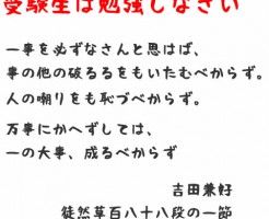 受験アドバイス 受験の格言京都大学吉田兼好兼好法師 一事を必ずなさんと思はば、・・・「受験生は勉強しなさい」受験の格言・名言 受験勉強を恥ずかしく思っているのか、「俺は勉強してないぜオーラ」を出している人がいます。 一日10時間も勉強するなんて恥ずかしいと思っている人がいます。⇒受験生の勉強時間アンケート 5月のこの時期に、合格が確定しているような大学はあなたの行くべき大学ではありません。 ⇒勇者となれ 受験生のやるべきことは受験勉強です。... 大学受験合格大作戦
