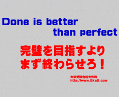 受験 受験の格言受験格言受験勉強 受験の格言「完璧を目指すよりまず終わらせろ!」 受験の格言「完璧を目指すよりまず終わらせろ!」 この言葉はFACEBOOKの創始者マーク・ザッカーバーグの言葉です。 Done is better than perfect 完璧を目指すより まず終わらせろ! 受験勉強をしていて、わからない問題が出てきたらそこで勉強を終えてしまう人。 たくさんいますよ~。 わからなくて... 大学受験合格大作戦